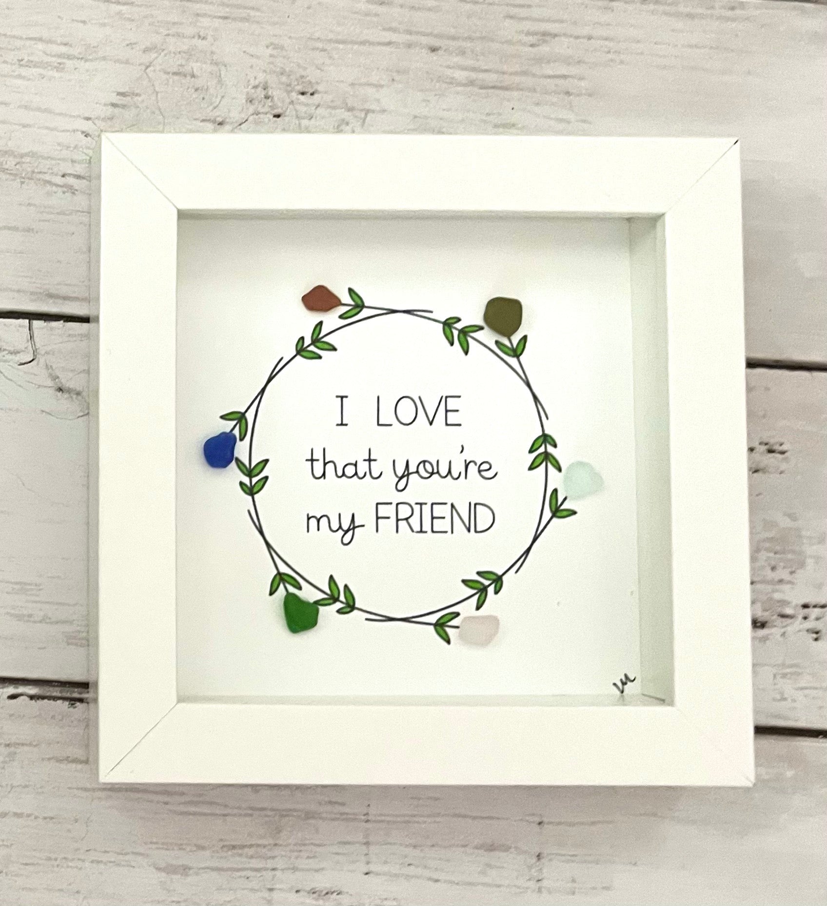 Share your feelings and appreciation for your bestie! This simple and delicate piece has genuine sea glass in a variety of colors and measures 6" x 6" in a white shadow box. This piece has a hook for hanging.