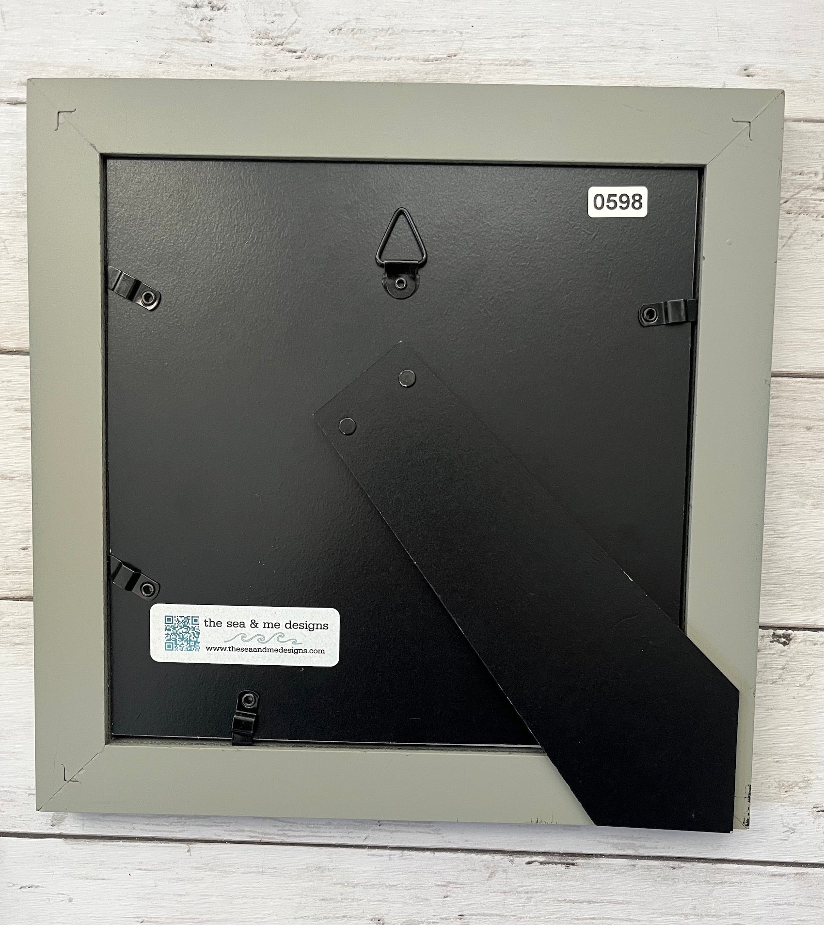 The frame is a textured gray and has an exterior measurement of 10" x 10" and the inner mat is opening measures 4.5" x 4.5". Can be hung or stand freely.